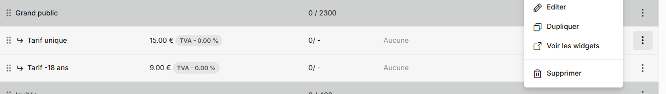 Pour ce faire, dirigez-vous dans l'interface de gestion de votre événement, onglet Billetterie/Inscription > Tarifs/Types d'inscription et cliquez sur les 3 petits points de la colonne Actions rapides puis Editer sur la ligne du tarif concerné.