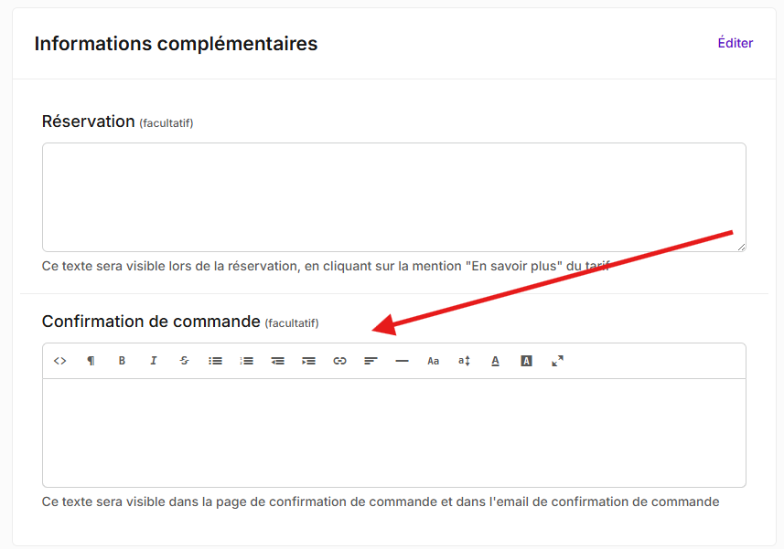 Dans la partie INFORMATIONS COMPLEMANTAIRES, vous trouverez un champ texte libre nommé Confirmation de commande, qui vous permettra de renseigner les informations complémentaires à faire apparaître sur l'email de confirmation de commande.