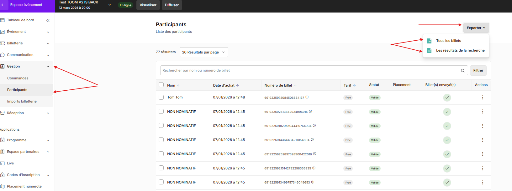 Pour les récupérer, il vous suffit de vous diriger dans l'onglet Gestion > Commandes de l'interface de gestion de votre événement, et de cliquer sur le bouton Exporter > Exporter toutes les ventes présent en haut à la droite . Vous obtiendrez ici un fichier CSV contenant toutes les questions posées à vos acheteurs.