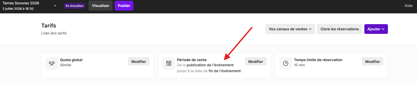 Si la date de fin de vente est dépassée, modifiez-la si vous souhaitez prolonger la vente. Vous pouvez vous référer à notre guide au guide dédié configurez la période de vente de votre billetterie