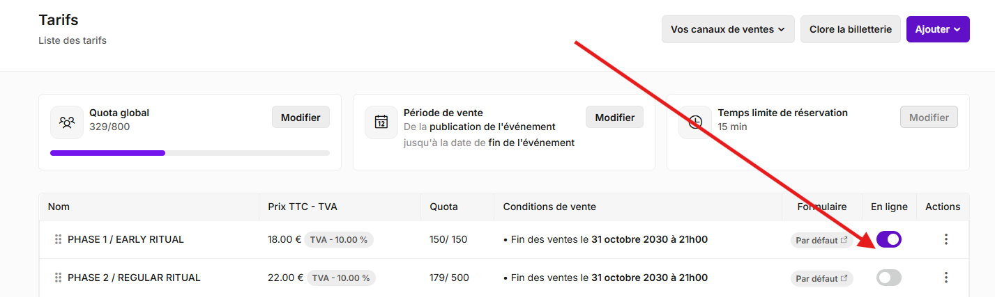Cliquez sur l'onglet Billetterie/Inscription > Tarifs/Types d’inscription et vérifier que la pastille “en ligne” est bien activée pour chaque tarif que vous souhaitez vendre.