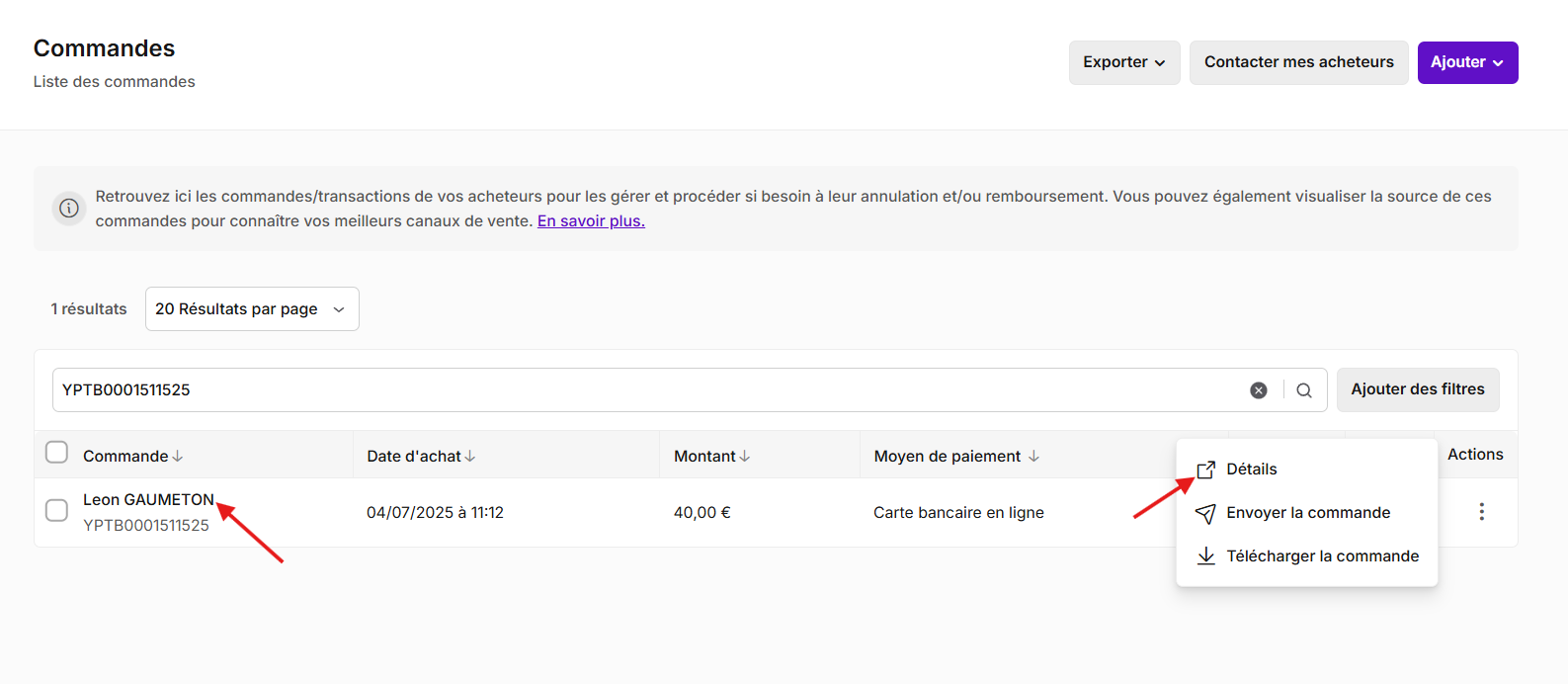 A la ligne de la commande : cliquez sur le nom/prénom de la commande, ou sur Actions > Détails