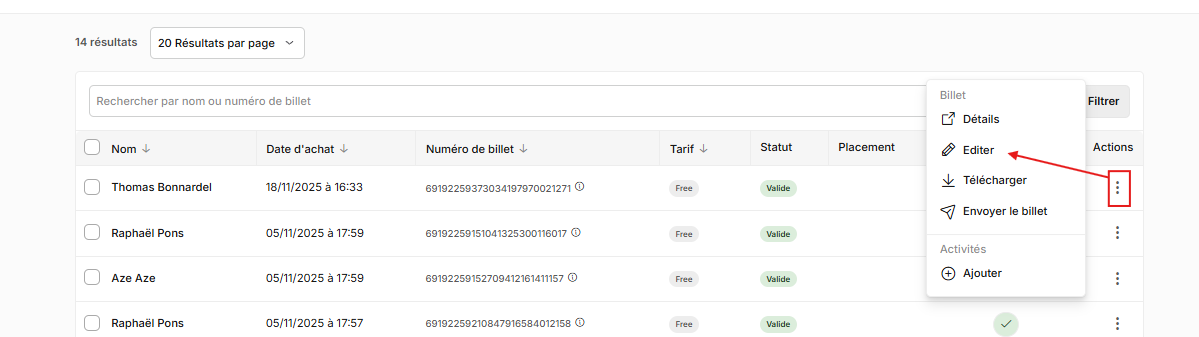 A la ligne du participant concerné, cliquer sur les trois petits points de la colonne Actions, puis sur Editer (entourés en vert dans le visuel ci-dessous) :