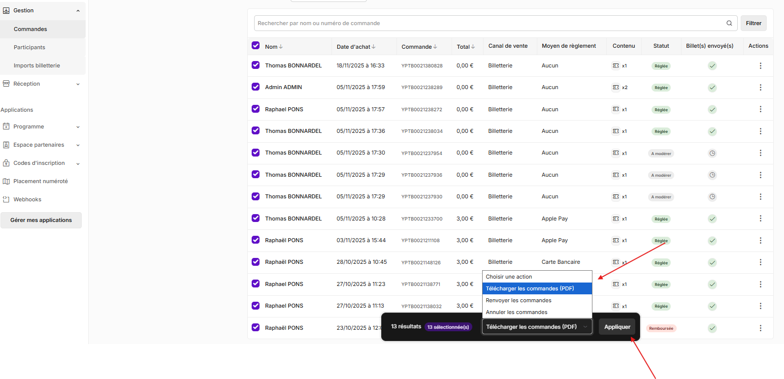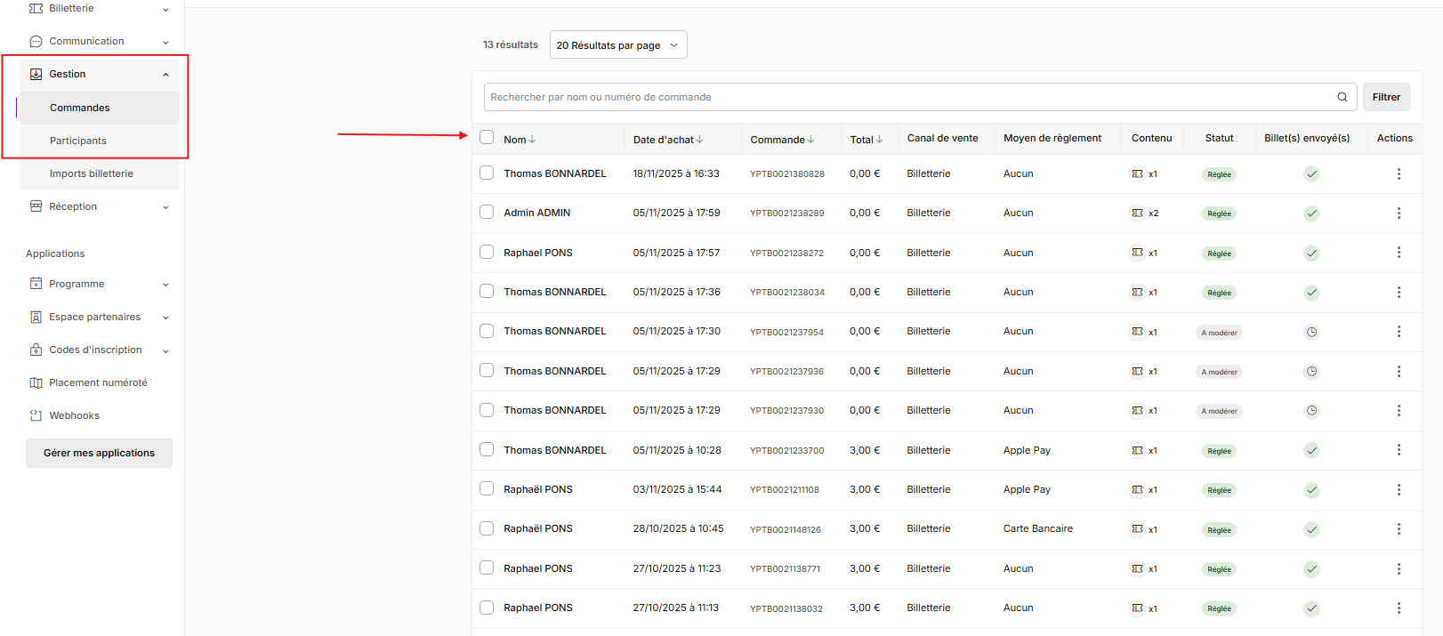 Pour ce faire, rendez-vous à l'onglet Gestion > commandes ou Participants :