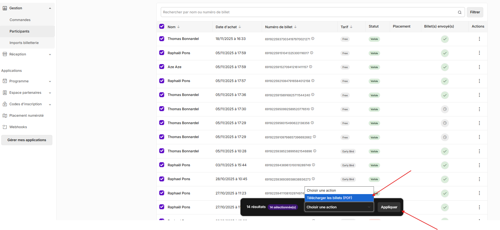 Vous pouvez tout à fait télécharger en un seul clic tous les billets des participants de votre événement au format PDF.