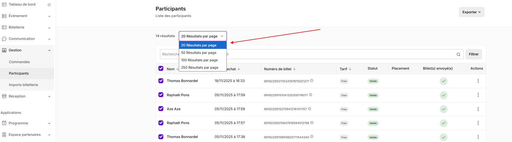 ⚠️ Le nombre de billets téléchargés correspondra au nombre de commandes affichées par page. Si vous avez un grand nombre de commandes, vous devrez peut-être répéter l'opération pour chaque page. Donc pensez bien à sélectionner le nombre de résultat par page avant de télécharger vos billets