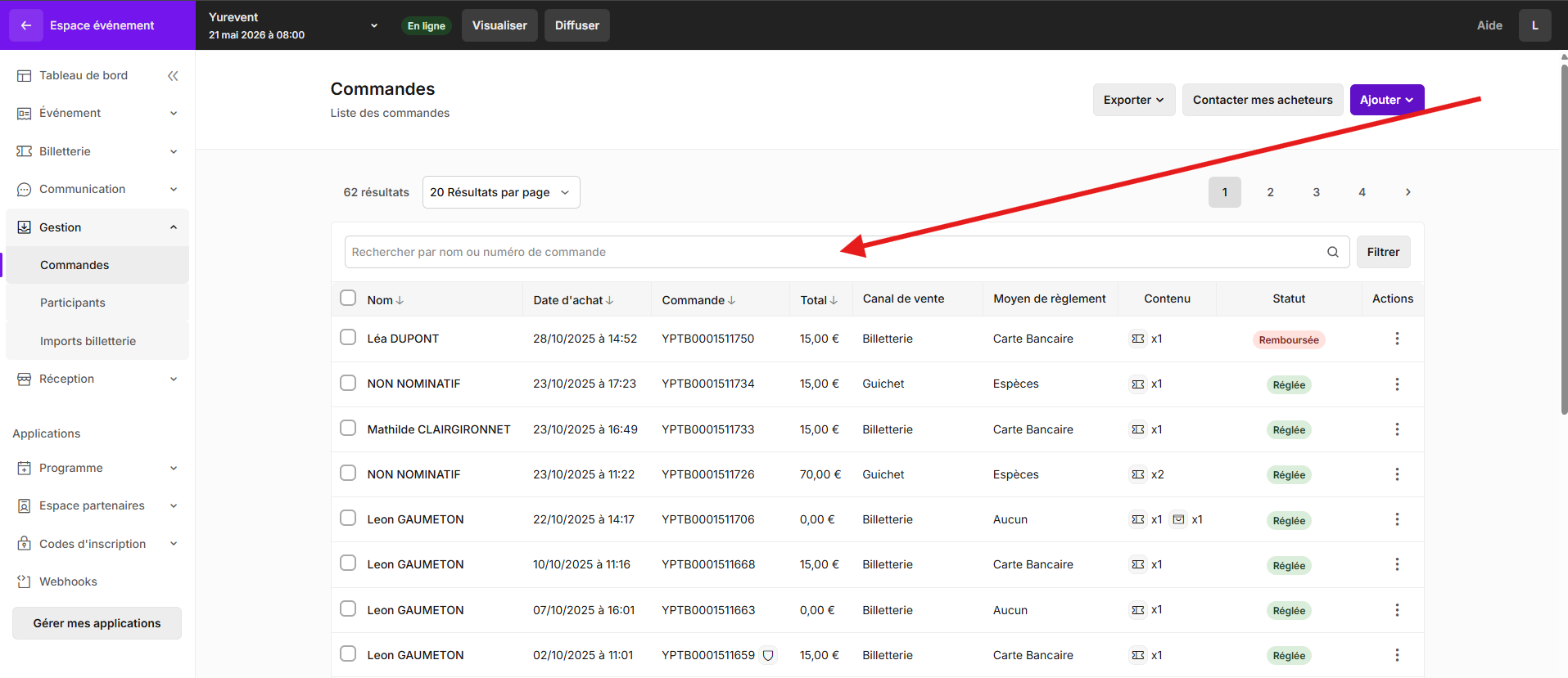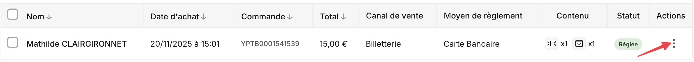 Cet onglet regroupe l'ensemble des commandes de votre événement. Chaque ligne affiche les informations suivantes :