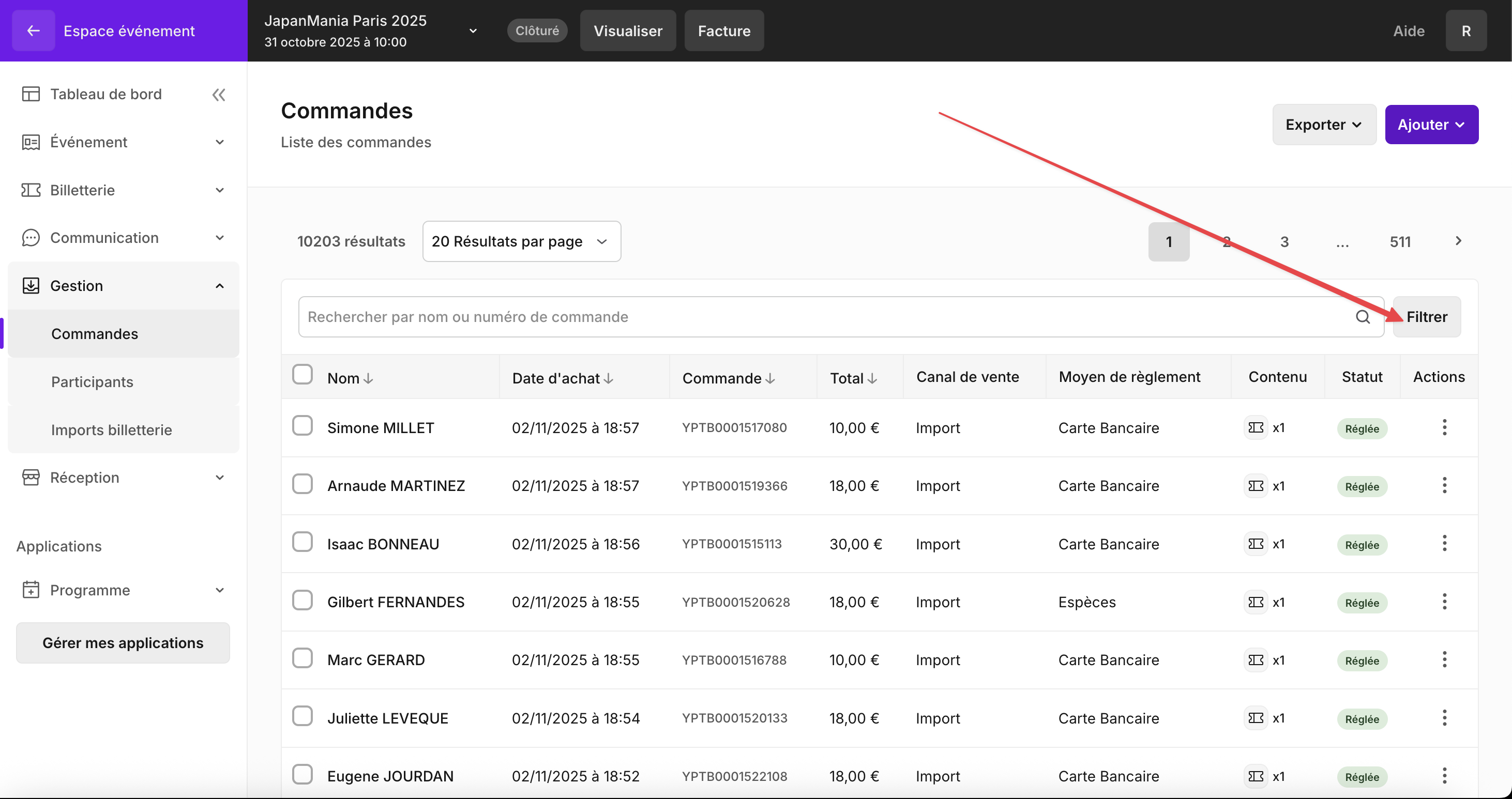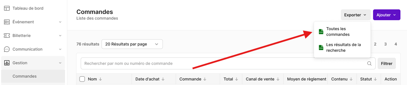Il est possible d'exporter la liste complète des commandes de votre événement. Pour ce faire, rendez-vous à l'onglet Gestion > Commandes puis cliquez sur le bouton Exporter en haut à droite puis Toutes les commandes.