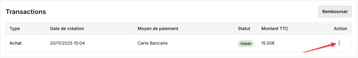 Pour chaque ligne de transaction, cliquez sur les trois points pour accéder aux actions suivantes :