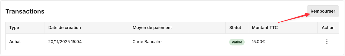 - Rembourser : lance le processus de remboursement. Disponible uniquement pour les commandes payées par carte bancaire en ligne et si l'événement n'est pas annulé.