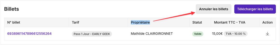 💡 Vous pouvez annuler des billets sans rembourser le Participant. Le statut du billet passera en Annulé mais aucun remboursement ne sera effectué.