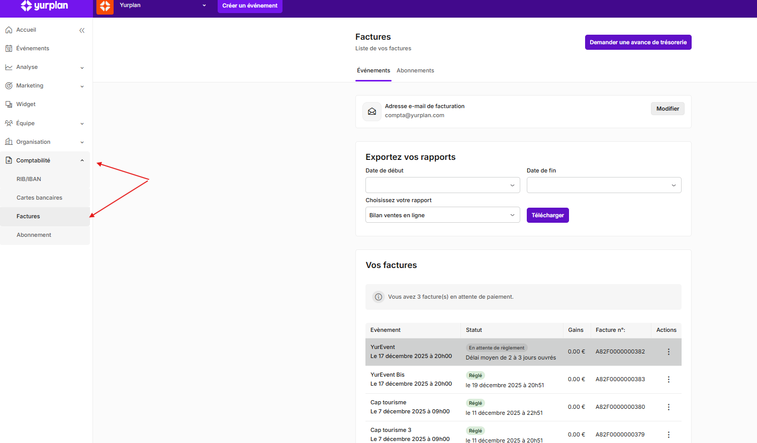 En tant qu'organisateur, vous avez la possibilité de retrouver l'ensemble de vos factures depuis l'onglet Comptabilité > Factures de votre espace organisateur.