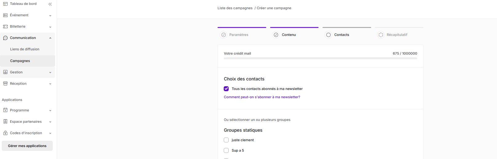 Sélectionnez les contacts ou groupes de contacts auxquels vous souhaitez envoyer votre campagne.