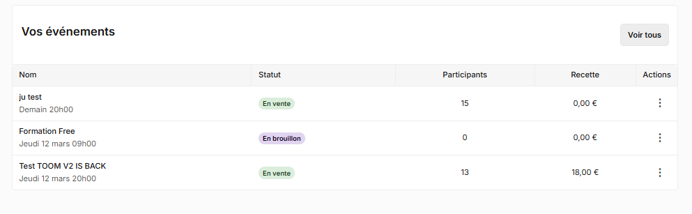 Le menu à trois points donne accès aux actions rapides sur l’événement (exemples fréquents : ouvrir/consulter l’événement, modifier, gérer la billetterie, dupliquer, etc. selon vos droits et options).