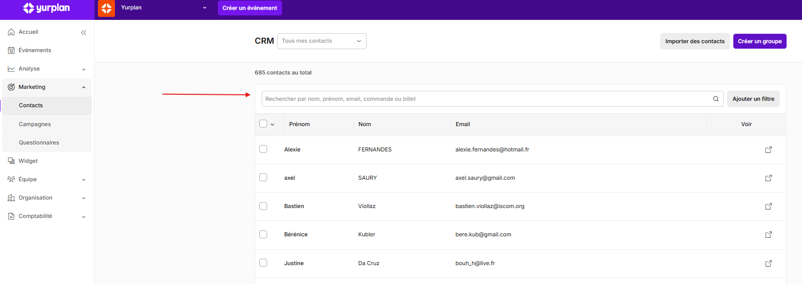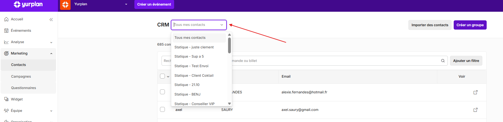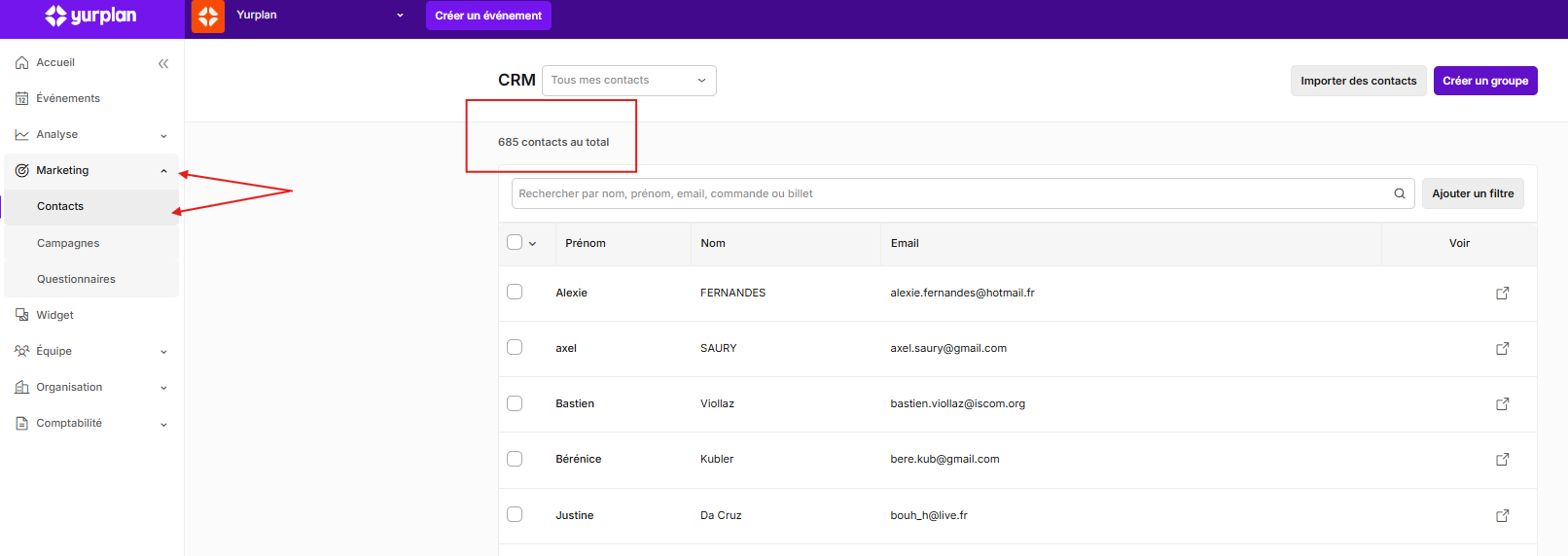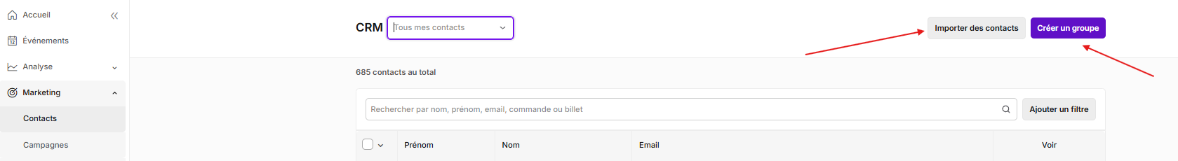 Vous pouvez accéder à la liste de vos contacts depuis l'onglet Marketing > Contacts