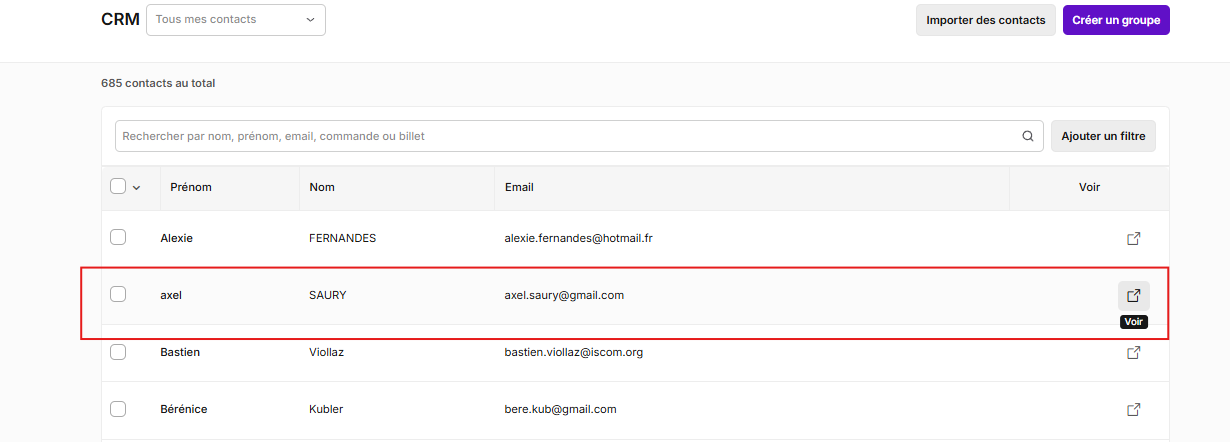 Afficher/modifier une fiche contact en cliquant sur la petite icone Voir au bout de la ligne du contact