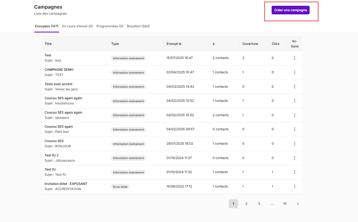 - Actions (⋮) : menu d’actions sur la campagne (selon le statut : consulter, dupliquer, modifier un brouillon, etc.).