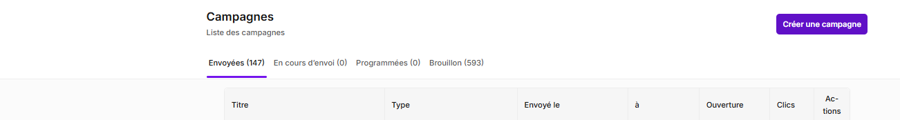 - Brouillon (593) : campagnes enregistrées mais non envoyées (et non programmées).