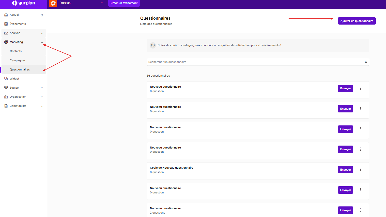 Accessible depuis l'onglet Marketing, la page Questionnaires vous permet de créer et gérer des formulaires à envoyer à votre audience : quiz, sondages, jeux concours ou enquêtes de satisfaction.