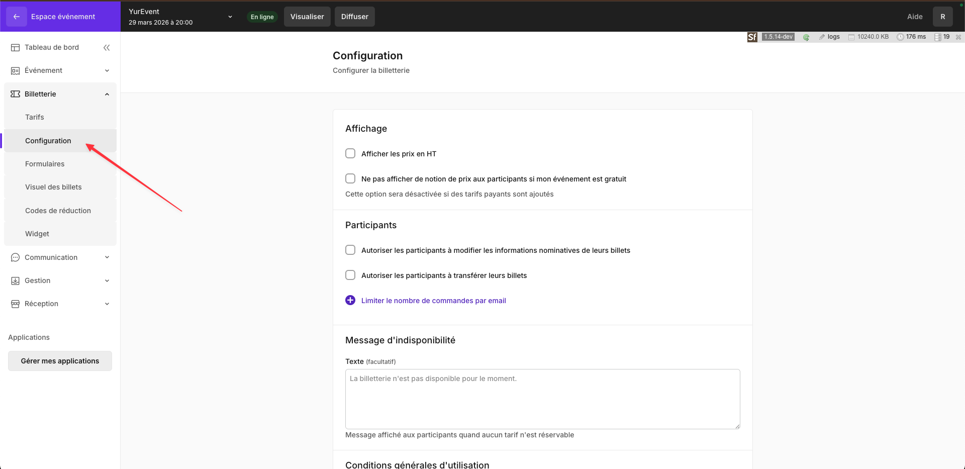 Vous accédez à l'ensemble des paramètres de votre billetterie. Modifiez les options souhaitées, puis cliquez sur Modifier la configuration en bas de page pour enregistrer.